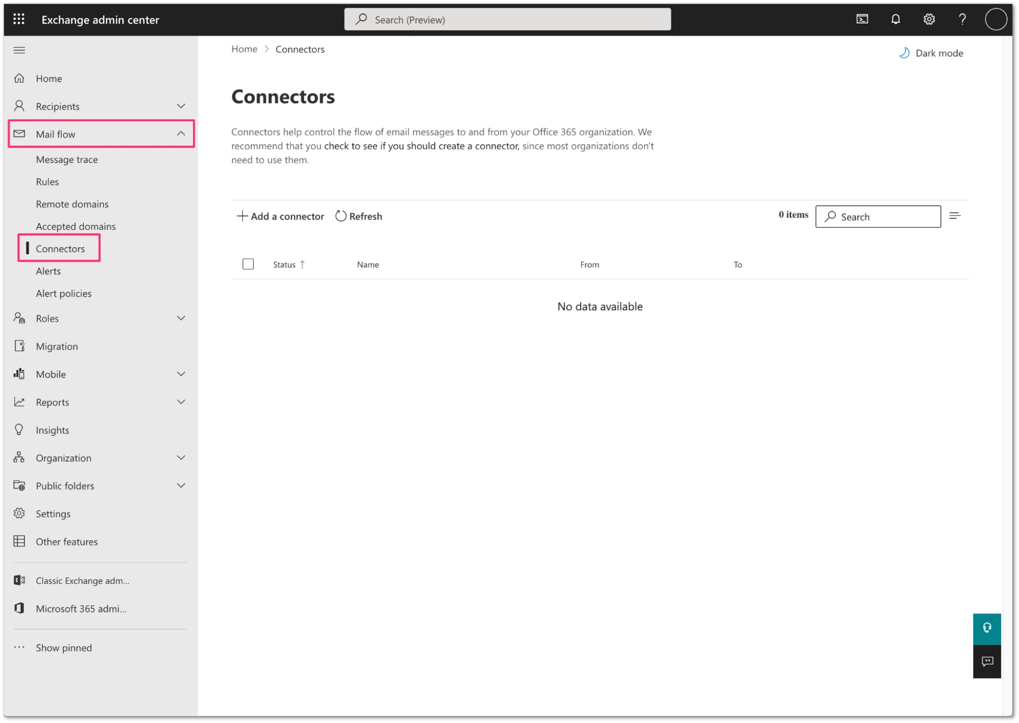 Log in to the Exchange admin center ↗, and go to Mail flow > Connectors.